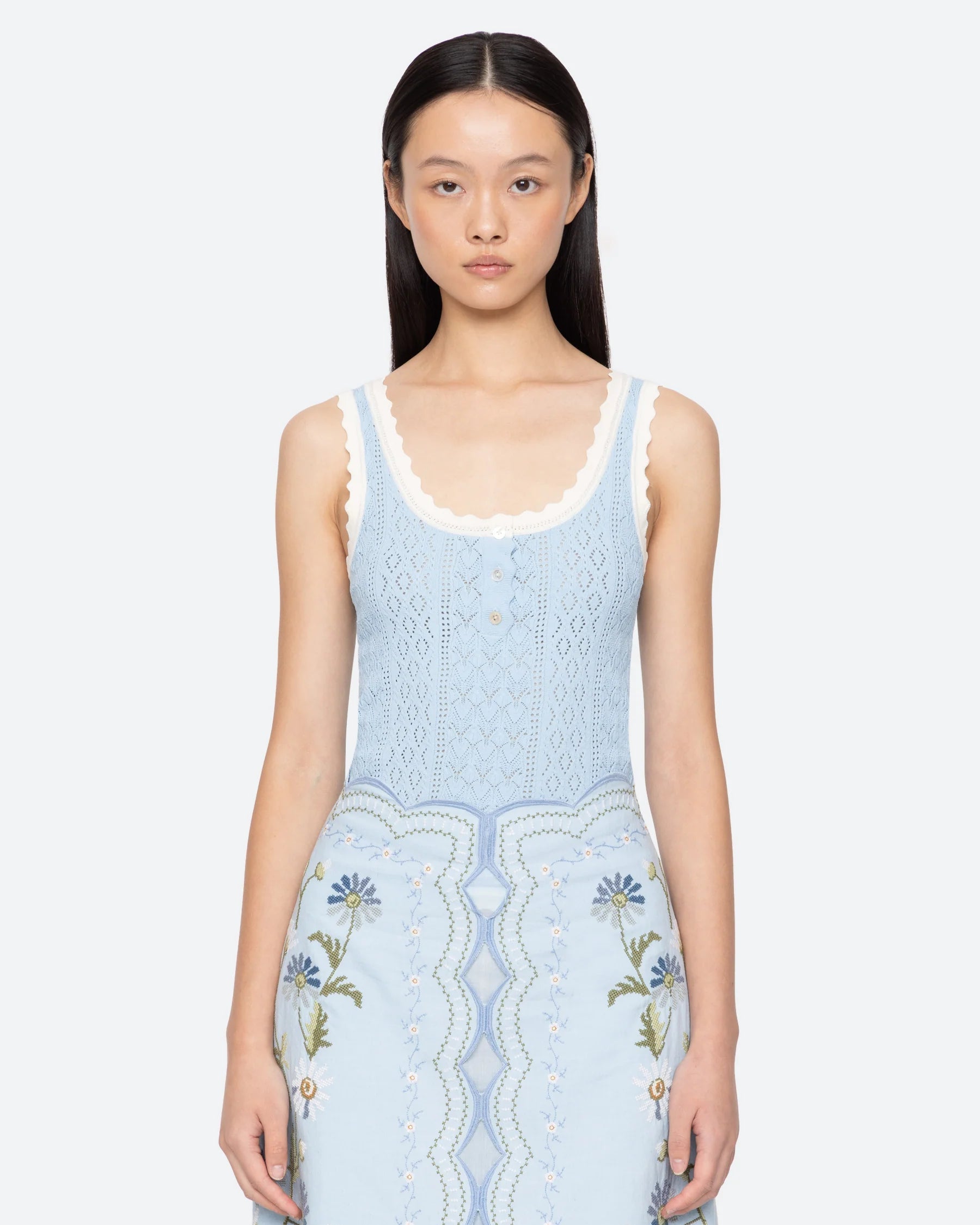 The Georgia knit tank features a delicate pointelle knit, scalloped edges, and a slim, flattering fit. Perfect for layering, it adds subtle texture and refined detail to any ensemble.